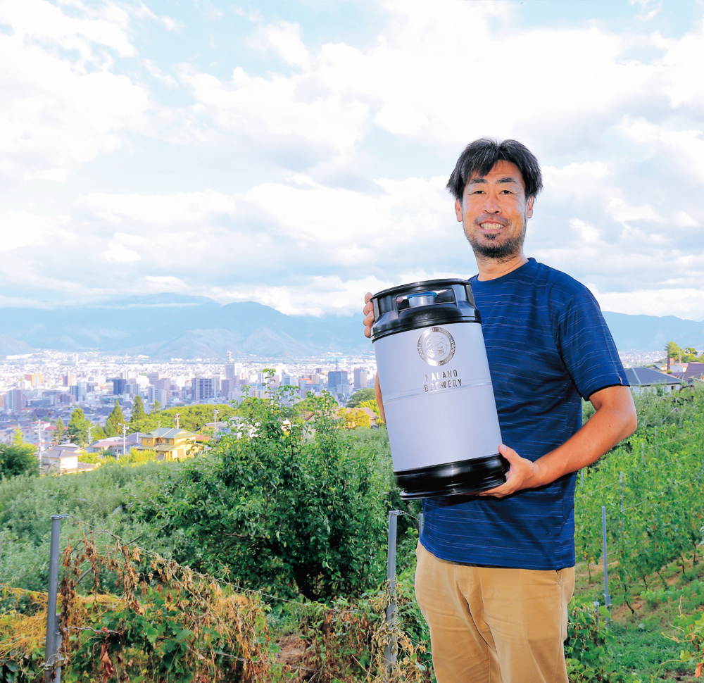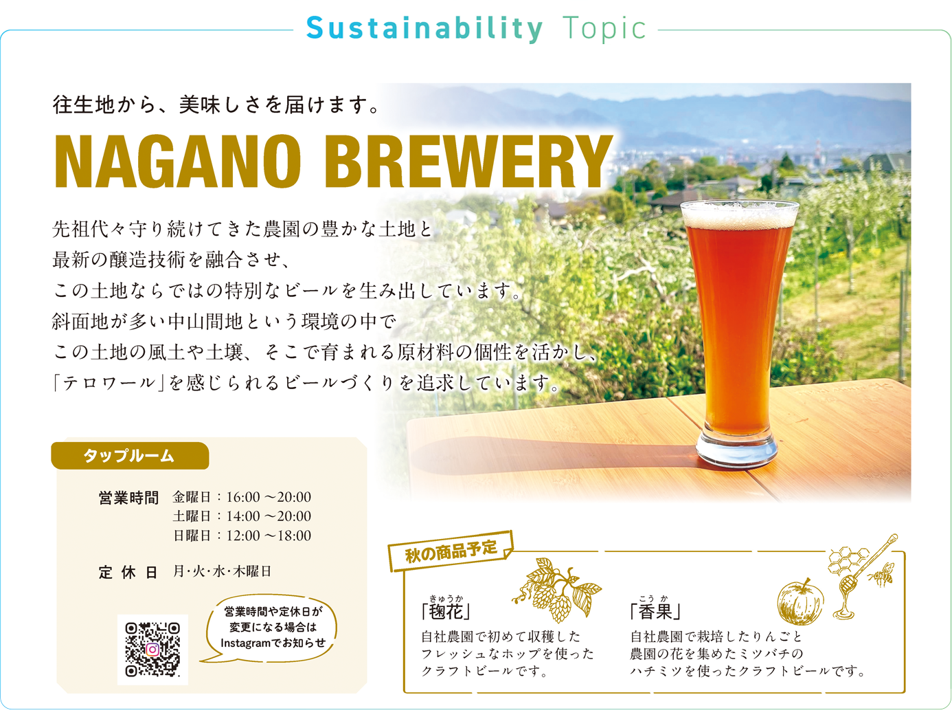 善光寺や往生寺の鐘が時を知らせるのどかな里山。急な坂道とりんご畑が連なる往生地に、ナガノブルワリーはあります。父から畑を継いで、目の前に広がる果樹園とその先に続く街並み、さらにその向こうに連なる美しい山々を改めて目にした時、「この風景を守りたい」と心から願うと同時に、守るためには里山の農業を活かし、新たな視点で産業を生み出すための一歩を踏み出さなければならない、と強く感じました。