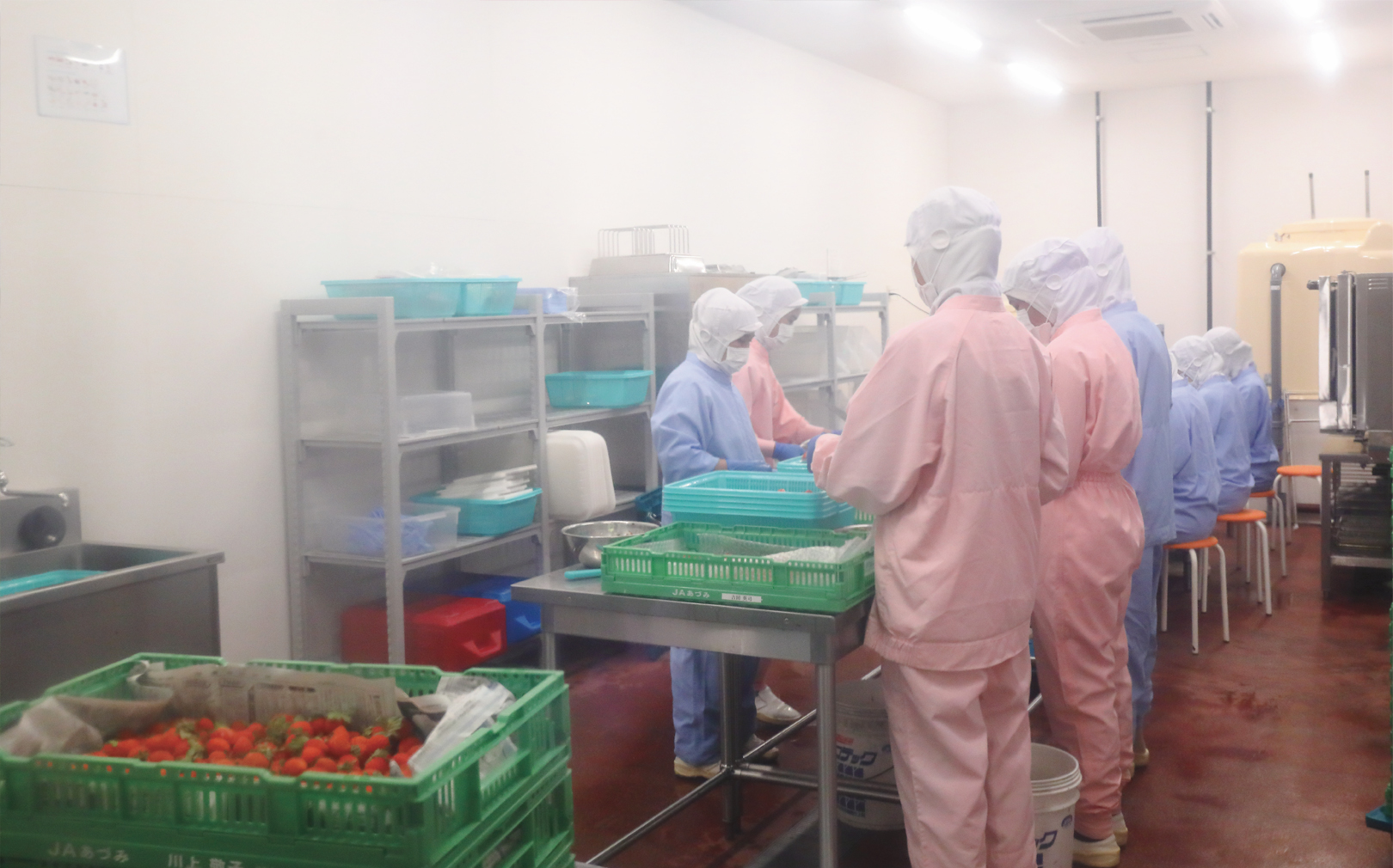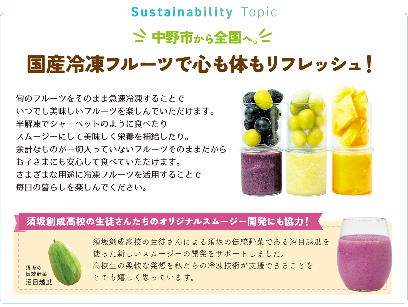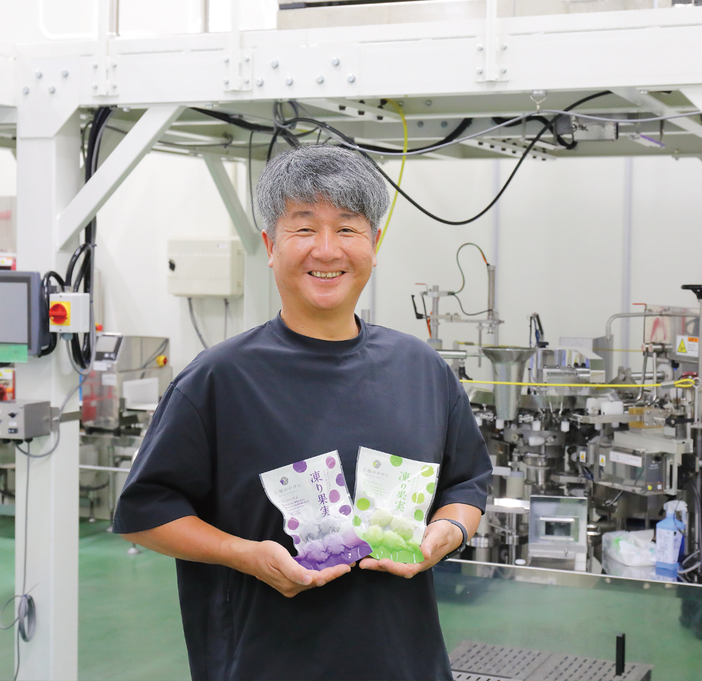 2022(令和4)年に新たに加工工場を建設。食品安全規格「JFS-B規格」を取得し、お客様に安心・安全な冷凍フルーツをお届けできる体制も整いました。もっとも美味しい旬のフルーツを食べやすい大きさに丁寧に加工して急速冷凍し、さまざまな需要にお応えしています。生のフルーツの香りや栄養を損なうことなく、いつでも好きな時に好きな量を楽しむことができる冷凍フルーツの需要は、どんどん高まっていると感じます。なにより私たち自身が農業を営む者として、美味しいフルーツをもっと多くの方に楽しんでいただきたいと願っています。ぜひ一度、冷凍フルーツの美味しさを味わっていただきたいと思います。