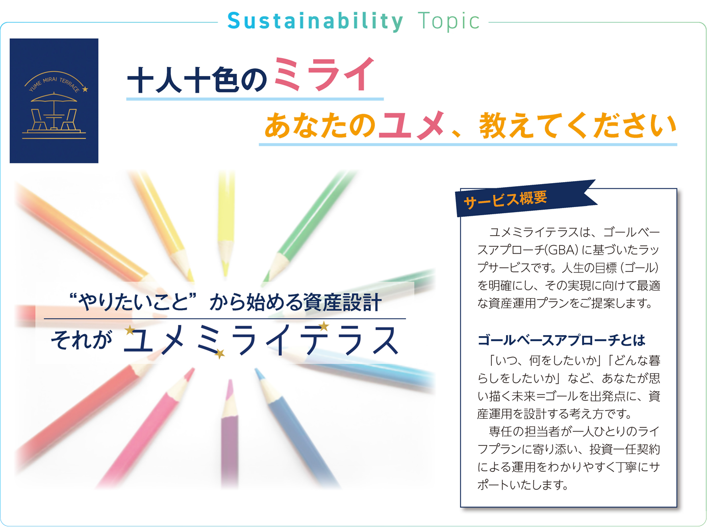 長野證券は「長野県SDGs推進企業」第1期登録企業として、2019年よりさまざまな取り組みを展開しています。社内においては、電力使用量やCO2排出量削減等を数値化し、目標を定めて年度毎にチェック。小さいことですが、ペットボトルのキャップを「NPO法人エコキャップ推進協会」へ寄付する活動も続けています。また、日本証券業協会の「株主優待SDGs基金」を通じ、株式の優待券等を利用して「国連WFP」や「緑の募金」へ拠出する活動も行っています。