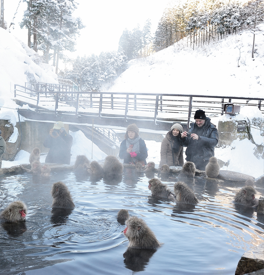 野生のニホンザルの生態観察と保護を目的として開苑した地獄谷野猿公苑は、今も多くの研究者が訪れ、サルの生態観察が行われています。苑内で餌付け用に用意しているのは、大麦や大豆、りんごなど。餌づけではありますが、餌やりショーではありません。餌を与える時間も状況によって変え、告知もしていません。苑を訪れるサルたちはあくまでも野生のニホンザルであり、群れは移動しながら春は木の芽、秋は木の実など旬の味を求め、体が必要とする栄養を本能的に欲して動いています。季節や日によって、苑に来てもサルがいないのは野生である証。そんな野生の二ホンザルを間近で観察できることこそ、野猿公苑の醍醐味なのです。(2026年2月号掲載)