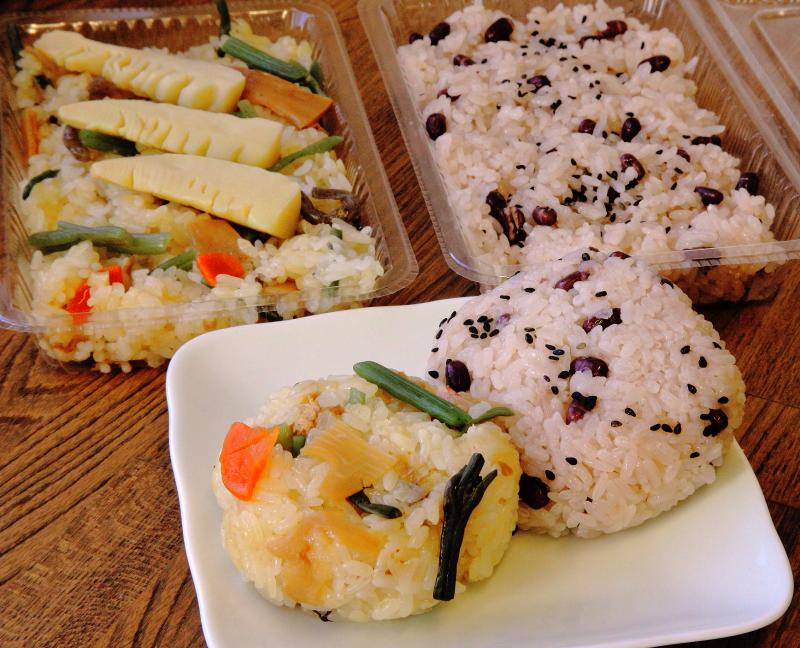 おこわ(取材時は山菜おこわ)・赤飯とも、おにぎり(1個150円)、パック(270g/400円)