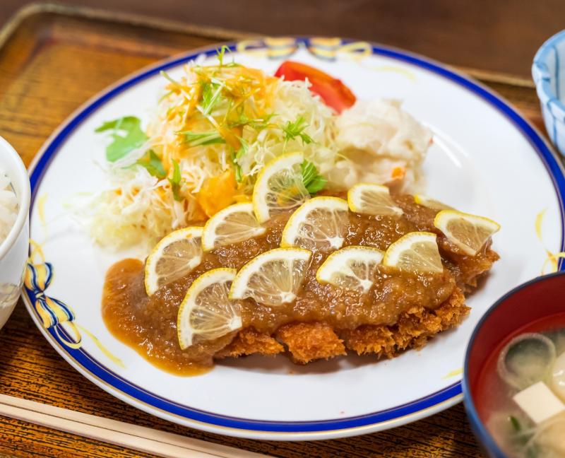 「厚切りみそカツ定食(1250円)」。甘辛い味噌ダレにスライスしたレモンの酸味がベストマッチ!